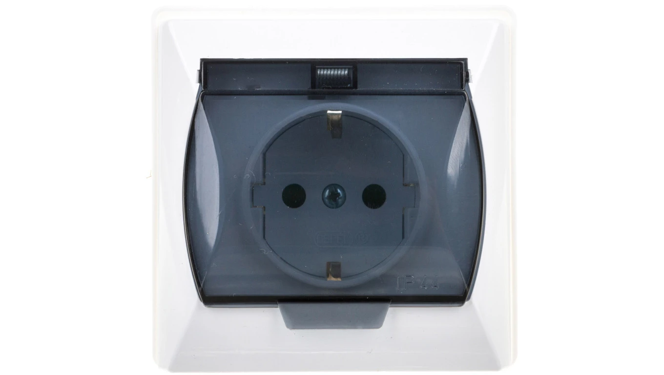 AKCENT Gniazdo bryzgoszczelne z/u Schuko IP44 z przesłonami klapka przezroczysta białe GPH-1ASP/00/d
