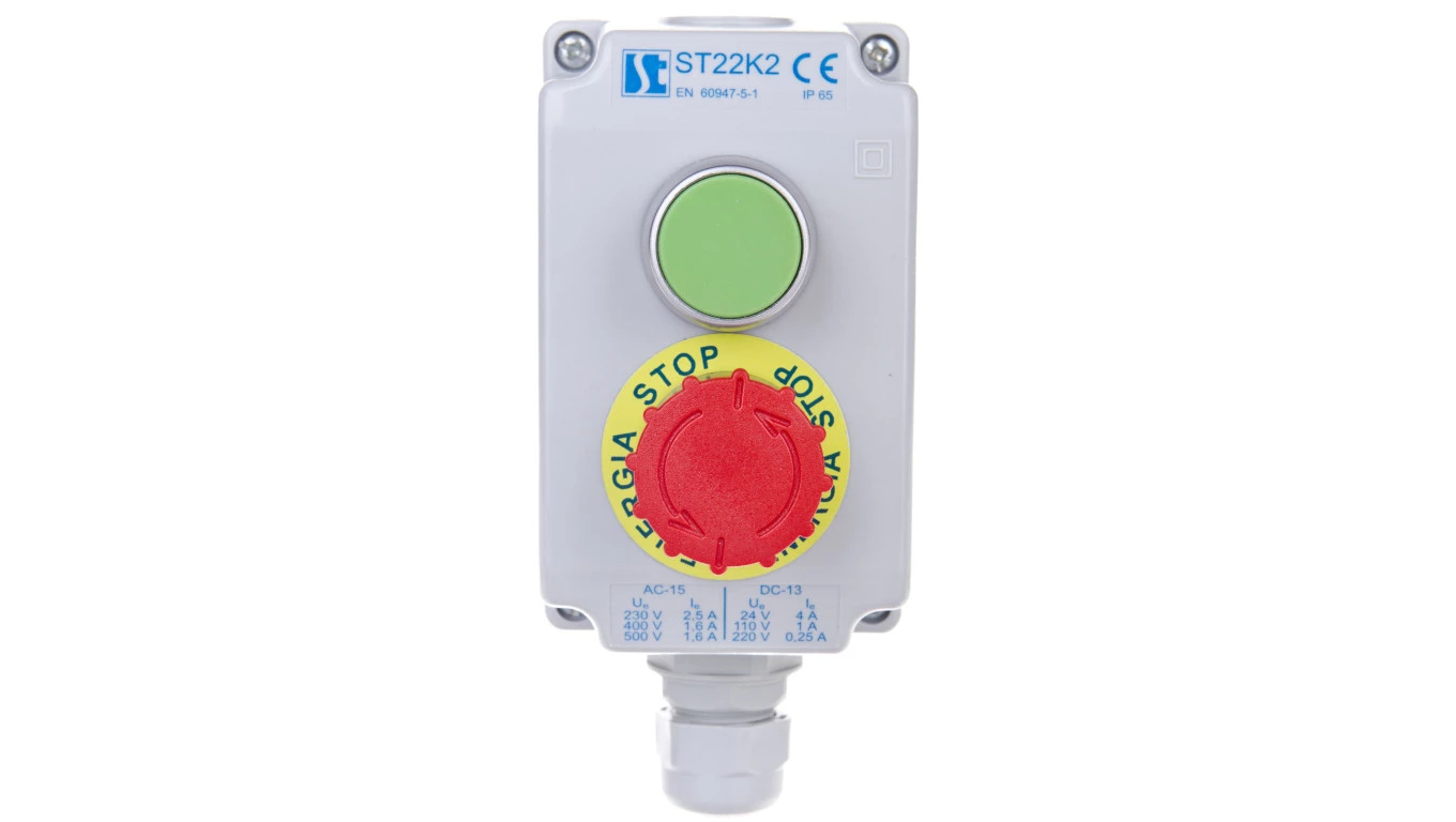 Kaseta sterownicza 2-otworowa zielony/przycisk bezpieczeństwa przez obrót 1Z 1R szara IP65 1x dławnica szara M20 ST22K2\04-1