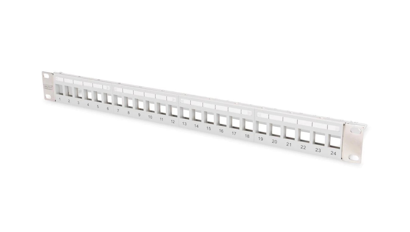 Panel krosowy modularny 19 24x keystone, ekranowany,1U,szary,prowadnica kabli,wymienne pola opisowe DN-91410-LF