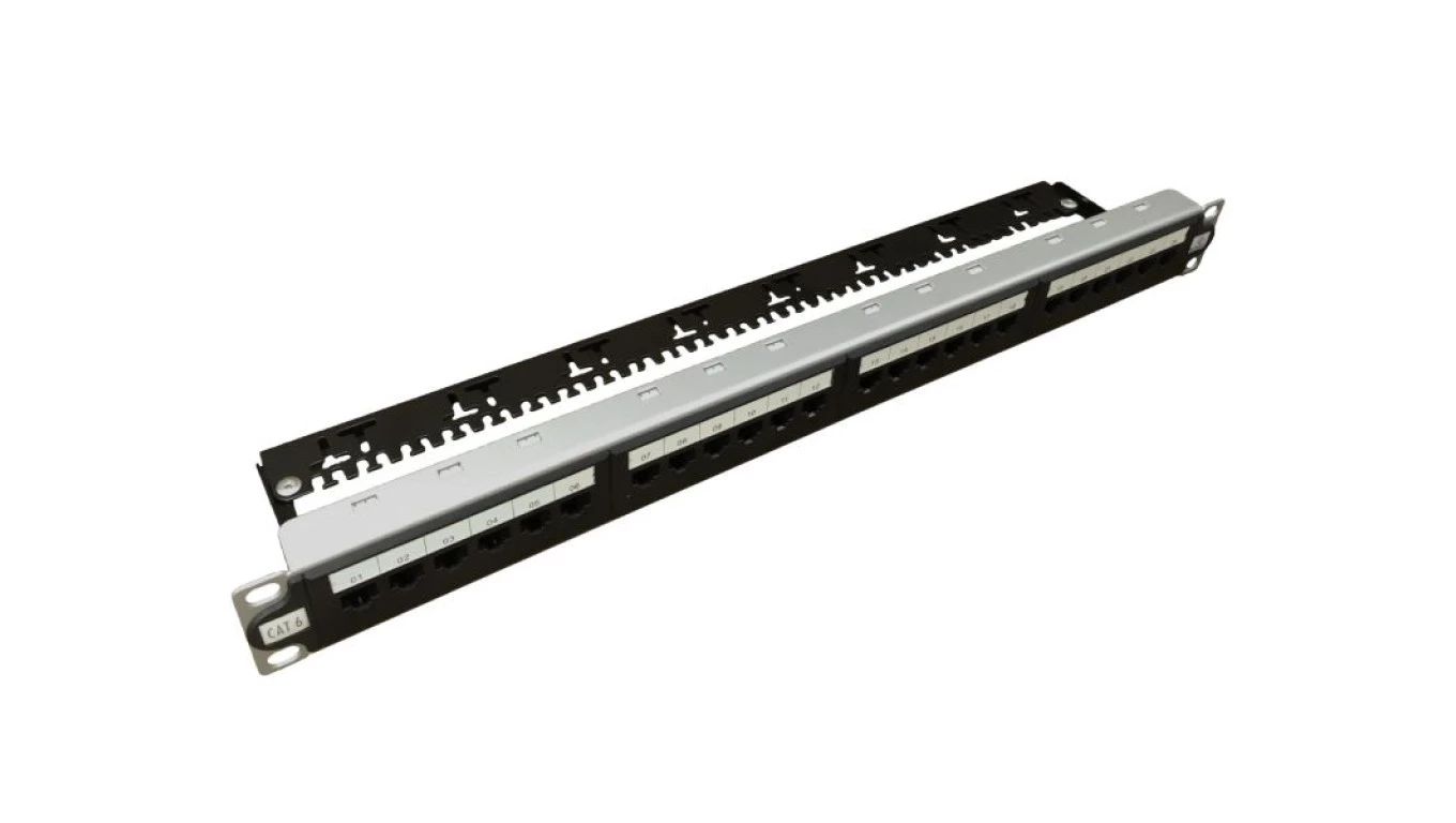 Patch panel UTP kat.6, 24 porty LSA z półką 1U Zwiększony zapas transmisyjny PK043
