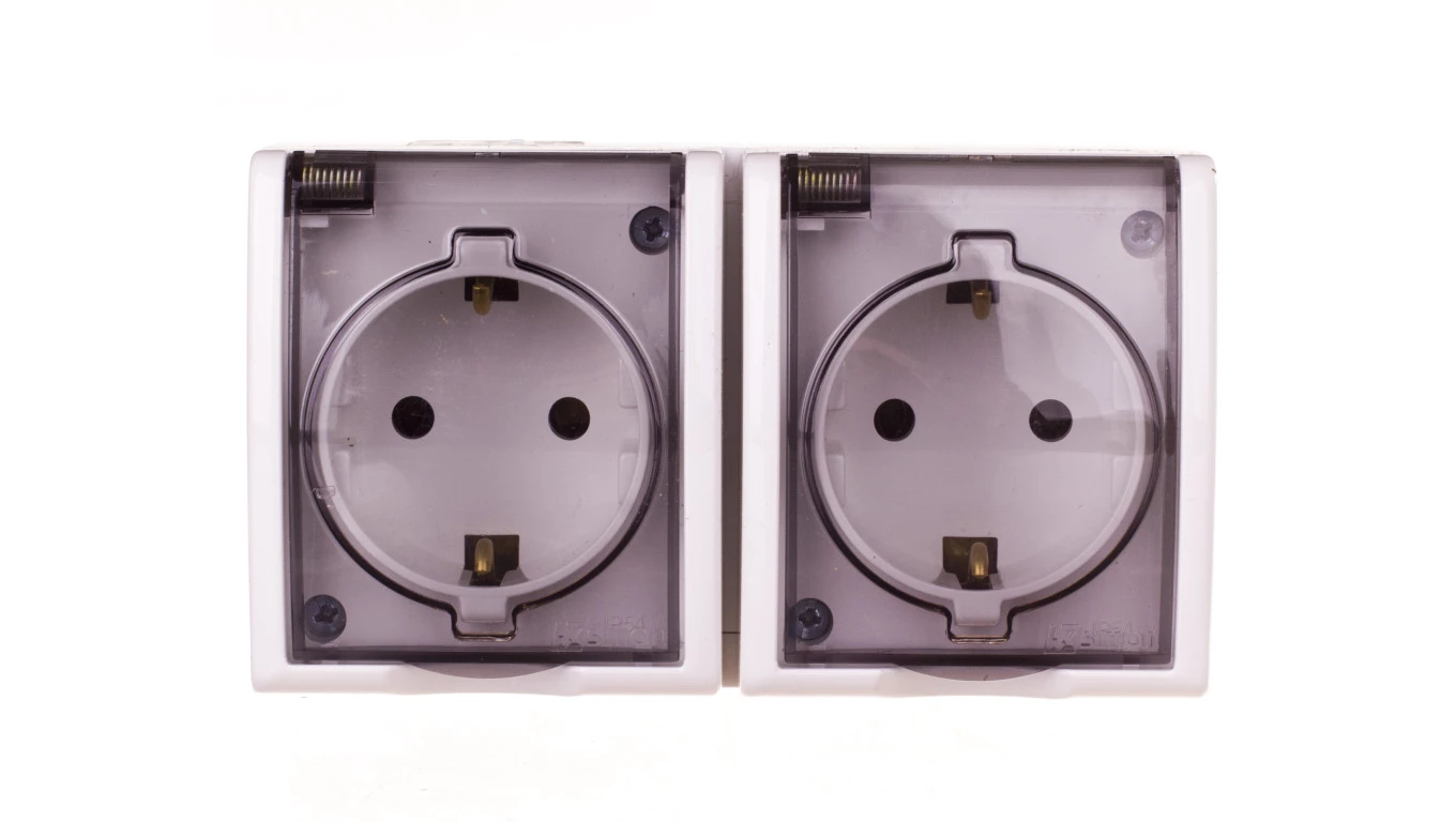 Simon Aquarius Gniazdo hermetyczne podwójne z/u Schuko IP54 z klapką dymną białe AQGSz1-2/11a