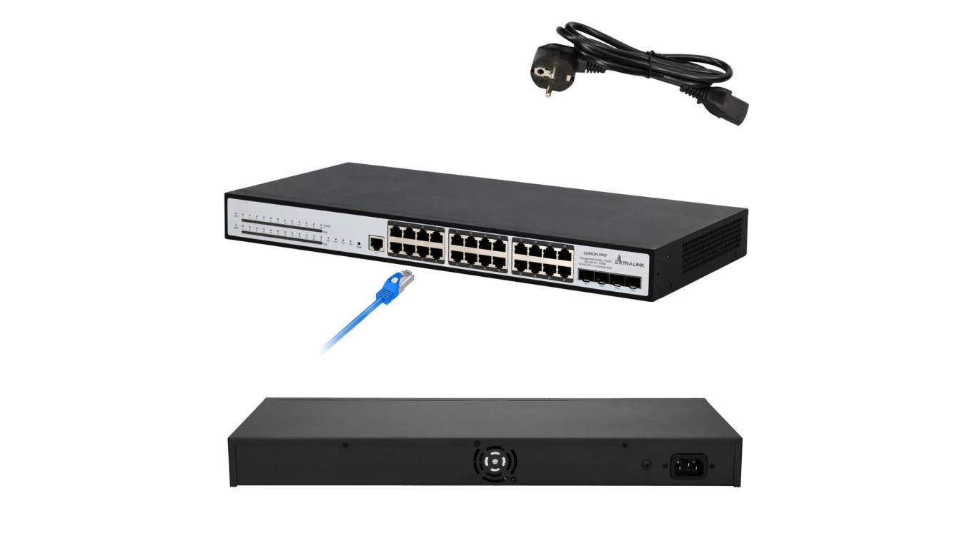 Switch PoE 24x RJ45 1000Mb/s PoE, 4x SFP+, L3, zarządzalny, 370W Extralink Chiron Pro