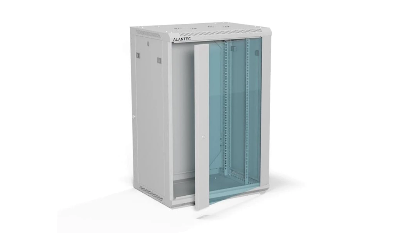 Szafa rack wisząca 19 cali 18U 600x450, drzwi szklane, tył i osłony boczne demontowalne, FLAT PACK kolor szary ALANTEC